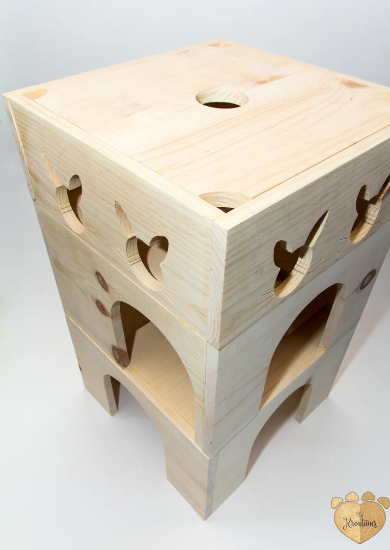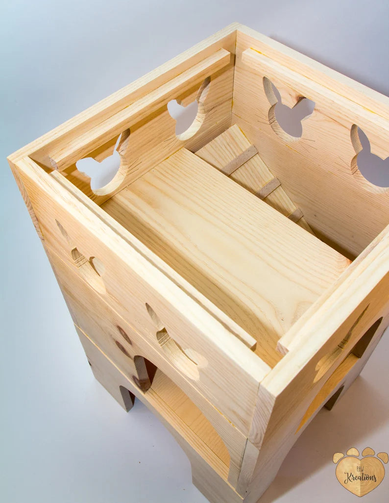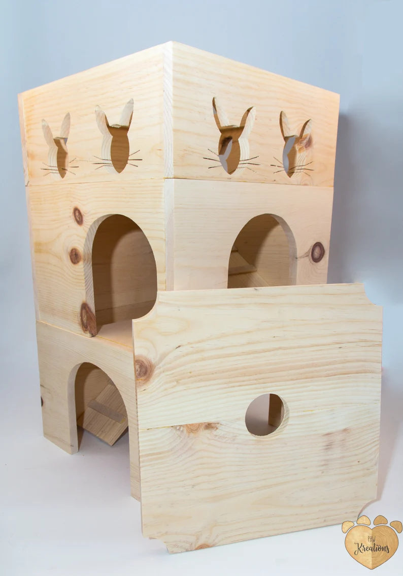 Here's something for you to fulfill all your needs(or at least the rabbits needs...). We have a two story handcrafted all pine structure that your rabbits can run, chew, jump, chew, play, chew, climb, and chew. Built with sturdy 3/4" pine wood and built with your bunnies digestive and toothy needs in mind, you won't find a scrap of metal anywhere inside. No nails, no screws, nothing for your bunnies to harm their cute tiny little teeth on.